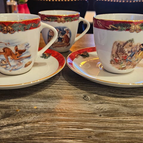 Nydelige kaffekopper m/tefat. Motiv: Askepott - Snehvit - Donald.