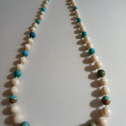 Vintage halskjede i hvit og blå farge, muligens 70-talls. I hvert fall 60-talls / 1970-talls stil. Kjøpt second hand. Materiale: plast
