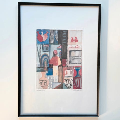 Selger et stort og vakkert trykk av den tyske kunstneren August Mackes "View into a Lane" (1914). Plakaten måler 90,5 cm i bredde og 115 cm i høyde, og kommer med original sølvramme.