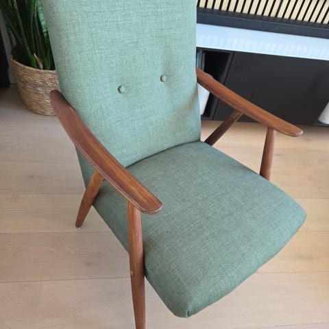 Kelly lenestol fra Lied Møbler i Liabygda på Sunnmøre. Utførelse i gul/grønn klassisk mønstret stoff. I god stand med normal bruksslitasje med tanke på alder.