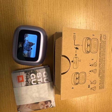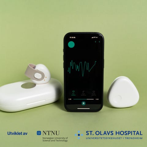 Den har med lader, og alle ledninger & fester til. (Øreflippfester, håndledd og klistrefester som du kan feste for fysiske smerter)