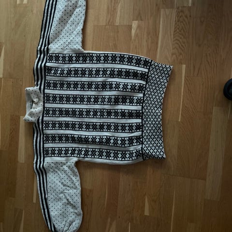 Meget pent brukt ulljakke/kort kåpe i svart-hvit mønster; strikket og tovet av en strikkedesigner på Østlandet; det følger med et skjerf i samme farge og mønster; god og varm; jeg fikk det i gave, men svart-hvit er ikke helt meg;