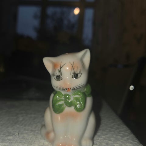 Fin gammel tekanne formet som en katt med en fisk. Ca 15cm høy. Fin rosa farge. Ingen skader.