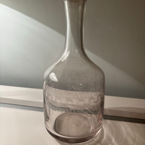Denne lekre, dreide flasken/muggen er svært pen, interessant og litt oppesen i sitt vesen. Den er ganske lav og lubben, med en stor hank som kunne ha virket overdimensjonert, men som fungerer svært godt. Den ligner en fint sveipet hale, og ligger dessuten godt i hånden. Den hvite leiren er bemalt med stiliserte, store blomster i blått, rosa og grønt. Tuten og hanken er lys blågrønn, blank og fin. Det er ingen skader, nagg eller andre merker. Flasken er signert, men jeg vet ikke hvem opphavsmannen eller -kvinnen er. Jeg tror kanskje det står «Boyle / 90».