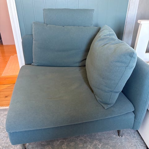 Har fått flenger på armlenene, men er veldig god å sitte i. Kan være behjelpelig med transport i Oslo og omegn for et tillegg i prisen. Tilsvarende selges f.eks.per dags dato på beliani.no for 2589 (etter det jeg forstår ekskl. fotskammel). https://n9.cl/wo395r