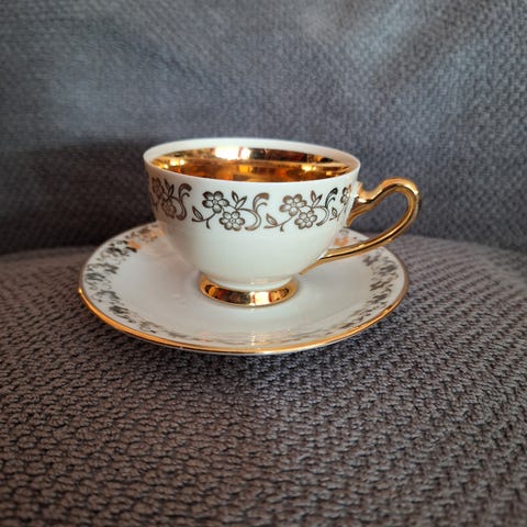 Selger 5 nydelige små kaffikopper/cappuccinokopper m/ underskål + 1 underskål u/kopp fra Porsgrunn porselen. 150,- + porto