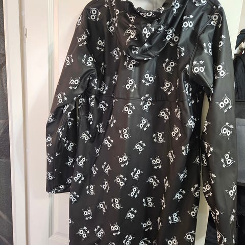 Normann kåpe for dame i størrelse 36. Kåpen er svart med hvitt, abstrakt mønster og har hette. Den har frontlukking med knapper, sidelommer og en glatt overflate. Innsiden ved kragen har mykt stoff for økt komfort. Passer som ytterjakke i overgangssesonger og milde dager.