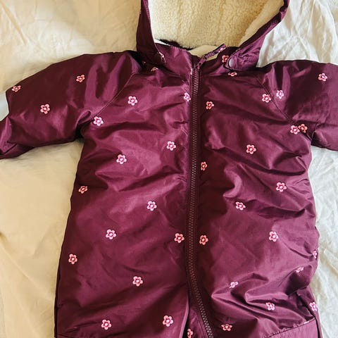 Lite brukt vinterdress til baby, str 74, fra Lindex. Posesko/tøfler følger med og kan kneppes fast i bena. Det er også en vottefunksjon (isydde votter) i ermene.