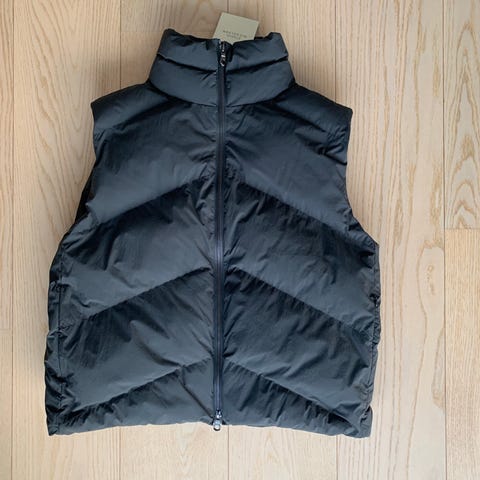 Vattert, teknisk vann- og vindavstøtende jakke fra Studio Nicholson. Størrelse large. 100% Polyamid med fyll av ecodown. Lommer i sidene God som ny!
