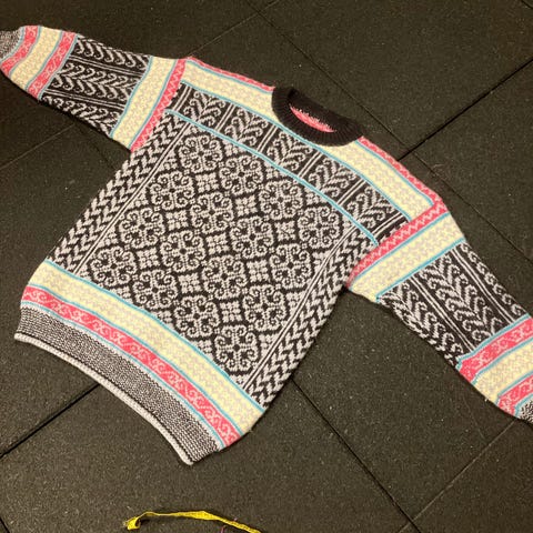 Genseren er det perfekte basisplagg med "det lille ekstra". Puffermer og kanter i vridde rettmasker er detaljer som skiller genseren fra fast fashion.