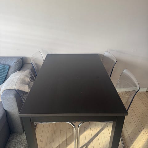 Fint firkantet bord med frostet glass plate ,praktisk og fint bord plass til 8 stk , har noen stoler som kan evt følges med
