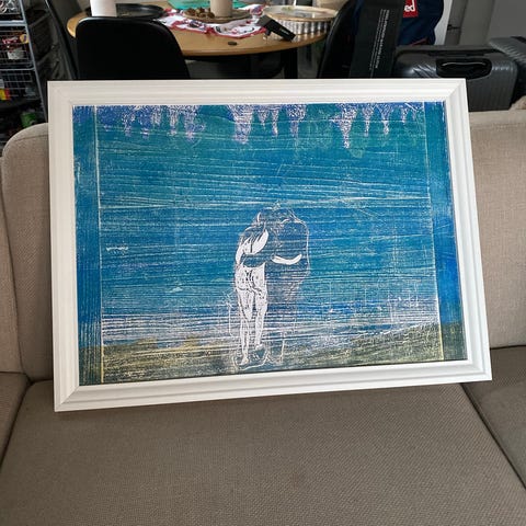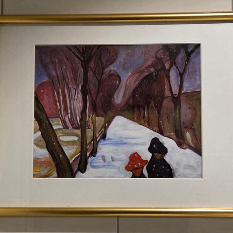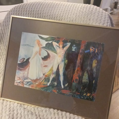 Munchs "Regnvær (på veranda)" , reproduksjon i ramme.