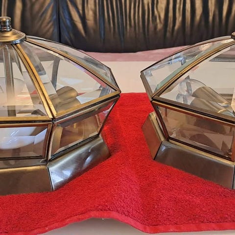 5-armet messing taklampe som er lite brukt. 5 grønne lampeskjermer kan også følge med.