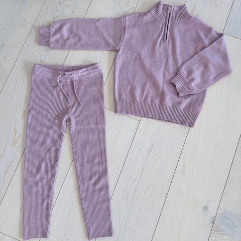 Grenser og bukse i str 122/128 i 100% merinoull. Lys rosa med brune striper.
