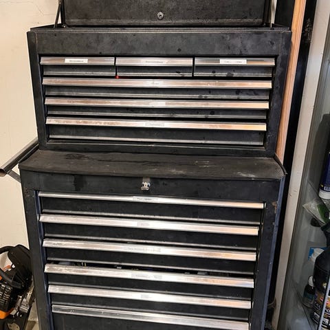 Vegghengte skapet har 5 boksene for verktøy, som er hengt opp etter dekselet eller håndtaket. Dette gjør at overskudd av olje eller kondensat fritt kan renne bort fra de pneumatiske verktøyene, som henger med håndtaket ned. For elektrisk verktøy er det en ladestasjon for batteriene plassert på øverste hylle i skapet. Der finnes en forlengelsesledning med stikkontakter 3 x 230V og 2 x USB 1A. Dette gjør det mulig å koble ladere til elektrisk verktøy og lade arbeidslamper.