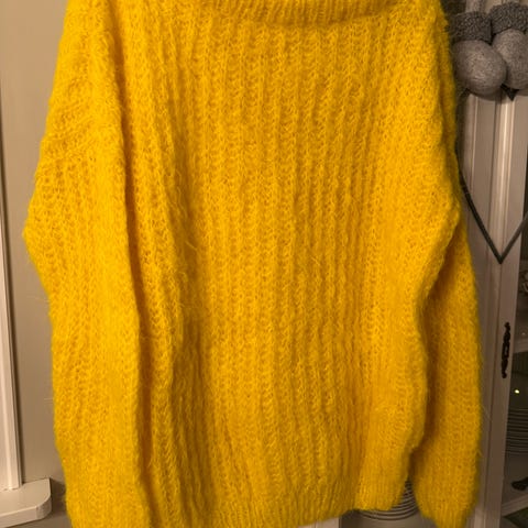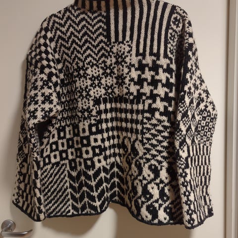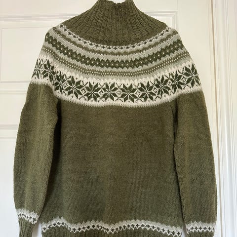 Hjemmestrikket genser i eskimo og Brussel alpaca garn. Nydelig og myk genser som dessverre ble litt kort for meg, 60 cm lengde. Ikke brukt