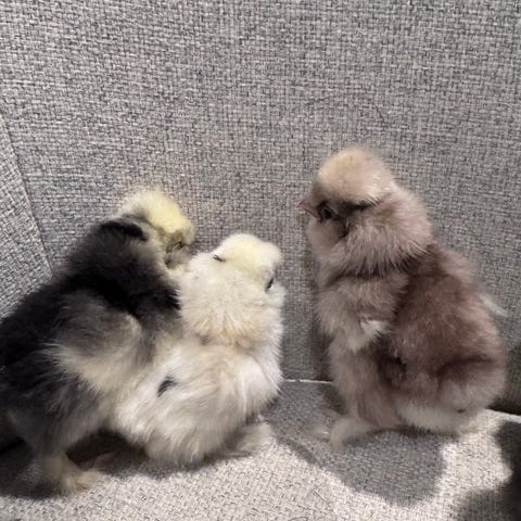 Har sort satinhøne i flokken og en nakenhals (showgirl) paint høne. Har også flere silkehøner i krøll silke.