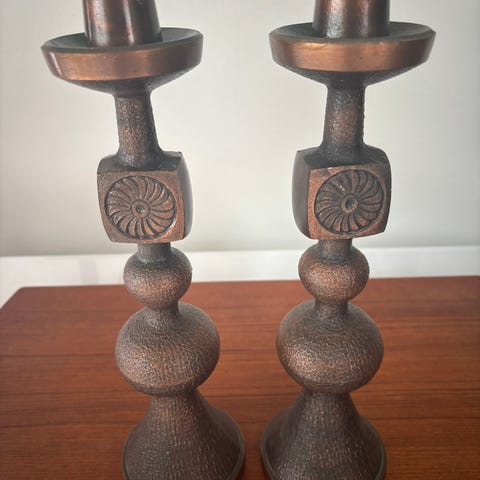 Eldre lysestaker, fremstilt i dreiet lyst treverk, med messingskål i kubbelys. Umerkjet og ukjent opphav. Høyde 49cm, diameter nede 19cm, diameter oppe 15cm, veier tilsammen 3kg. Fin stand, sender gjerne. k68