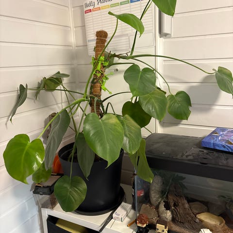 Høyde nå 16 cm. Kommer etterhvert med vakre blomster. Planten alene kr. 50 - inkludert ny strikket potteskjuler kr. 100.