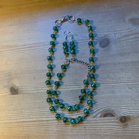 Ett veldig spesielt og vakkert smykkesett I kobber med grønne glass-stener. Det er laget av meg og er den eneste i sitt slag. Settet består av ett halsbånd og ett armbånd som matcher. Kobberen og den grønne farven utfyller hverandre perfekt, og gir ett slags mytisk utseende. Hvis du liker unike og håndlagde produkter, så er dette perfekt 😊😃