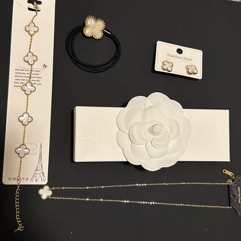 Selger ubrukt sett med smykke og øredobber, og et pent brukt armebånd.