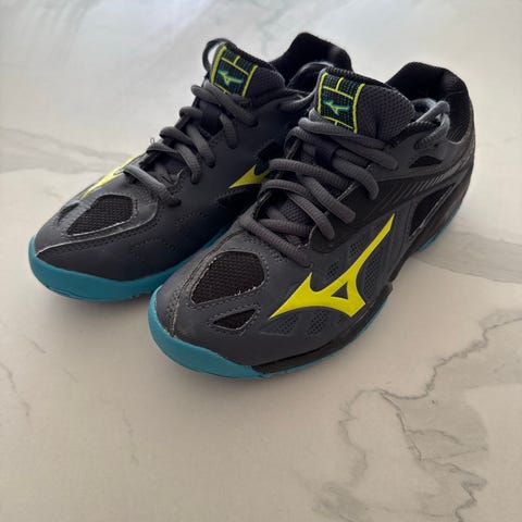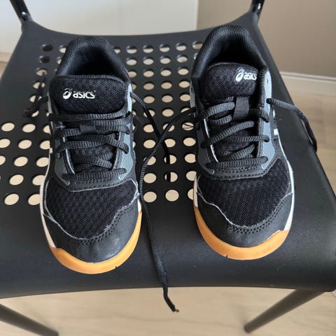 Fine håndballsko / hallsko / gymsko fra Asics i str. 34,5. Pent brukt av et barn i noen få måneder. Litt slitasje ved tåen, men har ingenting å si på funksjonen.