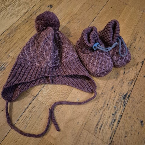 Nydelig sett med lue, votter & tøfler i 100% Merinoull (0-1 år)