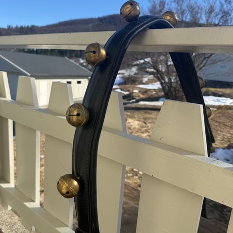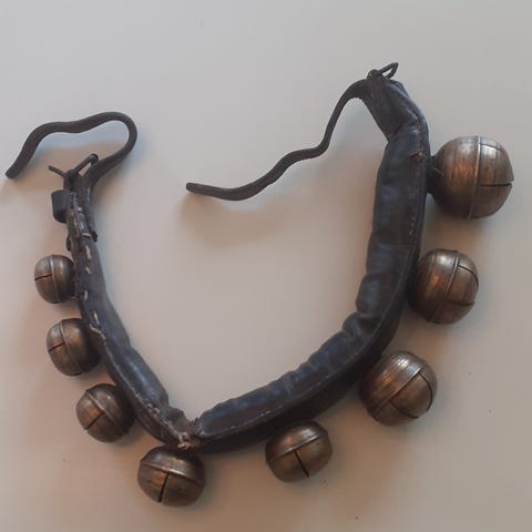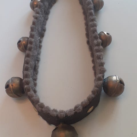 Hver del har 1 stk 8cm , 1 stk 7 cm og 2 stk 6 cm - bjeller. Spenne og reim til feste i begge ender .