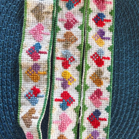 Kan se ut som rødt linstoff med broderi i bomull og gulltråd