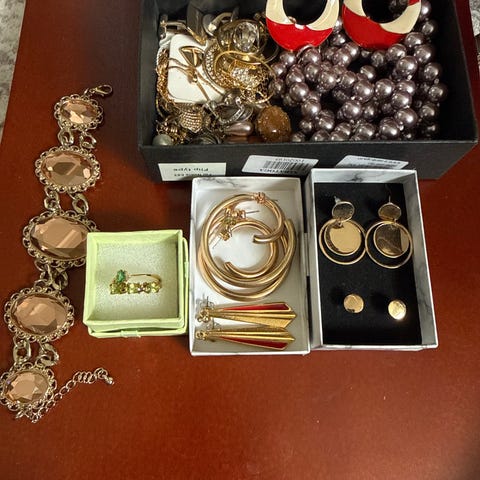 Fin smykkepakke med fine øredobber, loops, to ringer og et pent armbånd selges