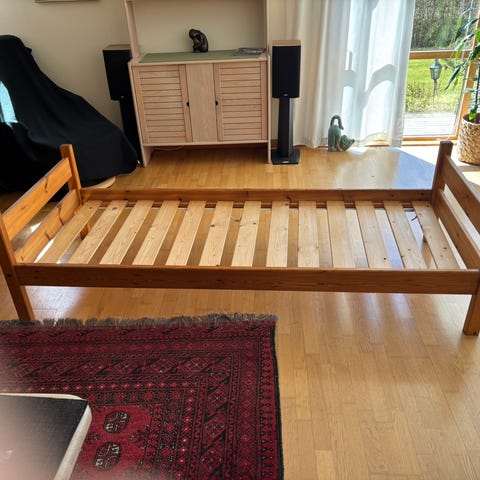Antikk seng i massivt tre. Orginal hel uttakbar madrass