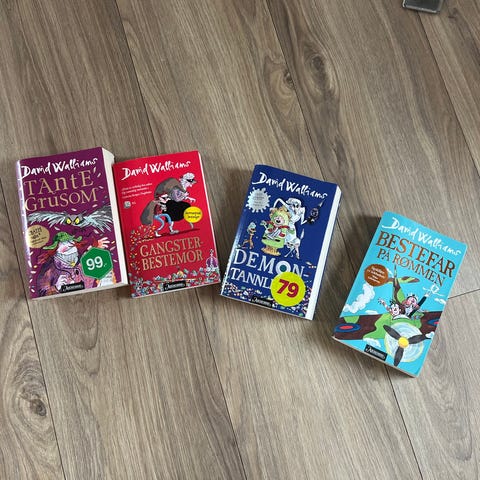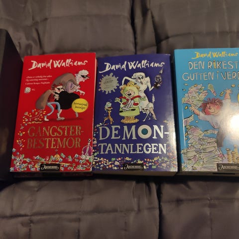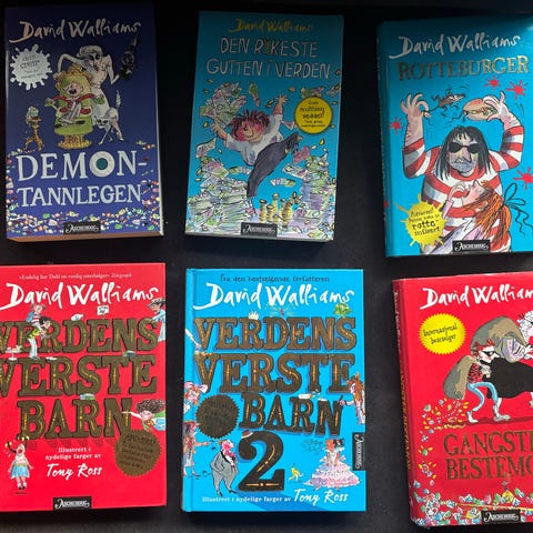 David Walliams barnebøker inkludert titlene Gangsterbestemor, Demontannlegen og Bestefar på rømmen. Bøkene er illustrert og rettet mot barn.