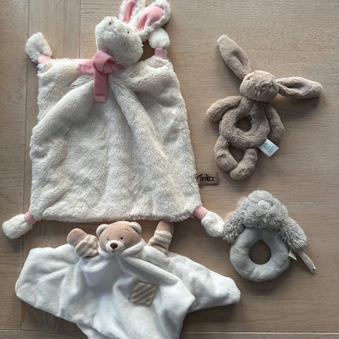 Fin koseklut, smokkholder, vognpynt med smokkholder og en myk babyrangle selges samlet .