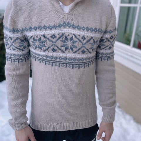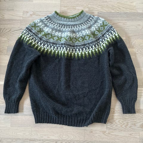 Hjemmestrikket herregenser i Alafosslopi garn.