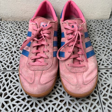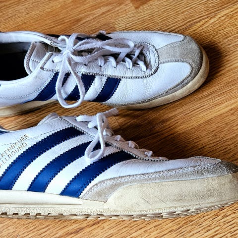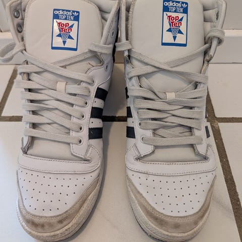 Original Adidas Top Ten. Skinnet har begynt å sprekke opp på grunn av alder. Sålen på den ene skoen er løs og har vært prøvd reparert av tidligere eier . Sålene er harde og stive grunnet alder. Selges som samleobjekt.