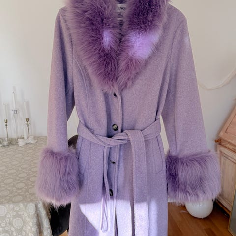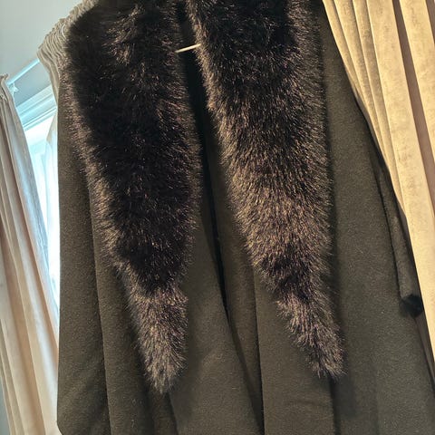 Annet yttertøy ullkåpe med pelsdetaljer for dame i størrelse M. Kåpen har en mørk farge og er laget med ullmateriale. Den har en elegant design med pelsdetaljer rundt kragen og hetten, noe som gir ekstra varme og stil. Perfekt for kjølige dager.