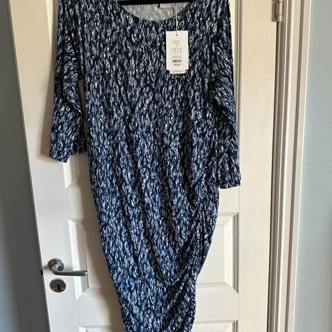 Nydelig blå velourkjole, puffes opp litt i midja og er flatterende på. Merke Soyaconsept. Brukt to ganger. Sender mot at kjøper betaler porto.