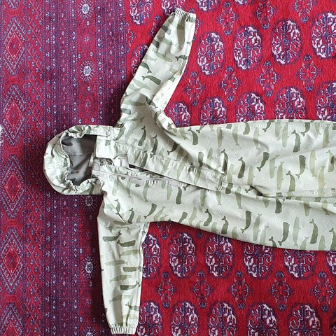 Slitasje på knær og rompe. Større rift nederst som kan lappes. Mye dress igjen.