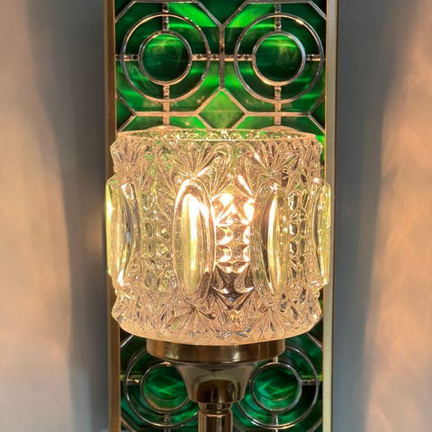 Litt spesiell da armen på lampen går ut til siden. Teak detalj og kobberfarget metall, lekkert lampeglass som kaster lys vakkert på veggen. Rengjort og satt på ny moderne kontakt.
