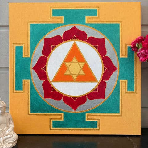 💛Sri Yantra eller Sri Chakra er en kompleks, holografisk matrise som symboliserer livmoren til de levendes mikrokosmos og universets makrokosmos. Interpenetrerende ni trekanter, sekskanter, kronblader og linjer utgjør dens unike geometri, som omfatter kausale, vitale og fysiske krefter, og åndelige så vel som vitenskapelige dimensjoner.
