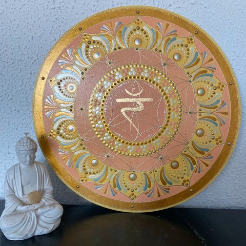 Gylden hvit Sri Yantra laget jeg med akryl teksturpasta på strukket lerret.