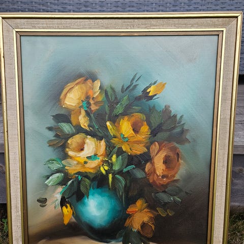Dette vakre maleriet av blomster er i pent brukt tilstand og måler 61x91 cm. Med sine flerfargede toner, vil det tilføre et snev av eleganse og liv til ethvert rom.