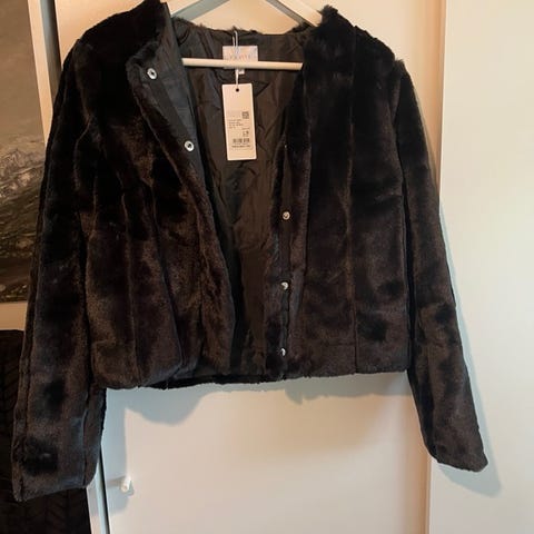 Fin fuskepelsjakke kjøpt på Match. Har hengt i skapet med lappen på. Selges fordi den nå er blitt litt liten. Her får du en flott jakke til vinterns festligheter.