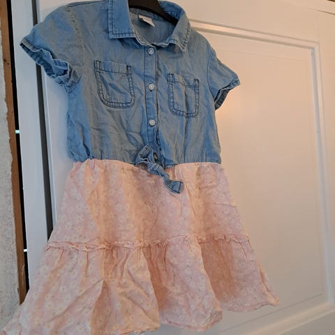 Kjempesøt sommerkjole med blomster og denim-overdel, str 6-7. Fra Lindex.