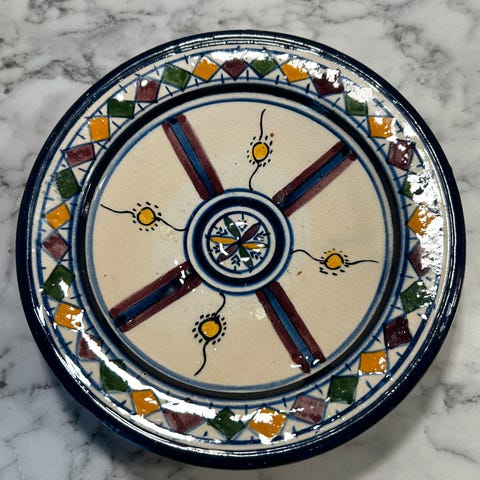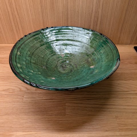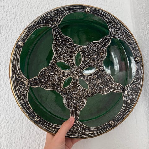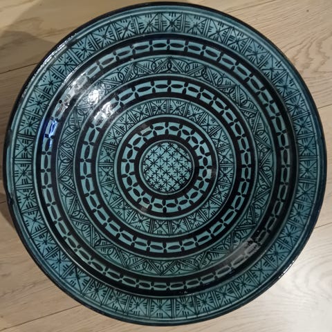 Trenger en vask og puss. Ganske tungt. Ca 50-55cm i diameter. Kjøpt brukt i Marrakesh 1999.