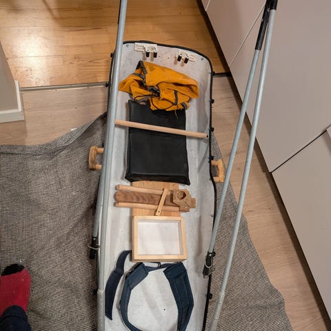 Godt solid pulk av tre, lit skade på ett bord, enkelt fiks, noe misfarging på trekk(hvit canvas) 250kr