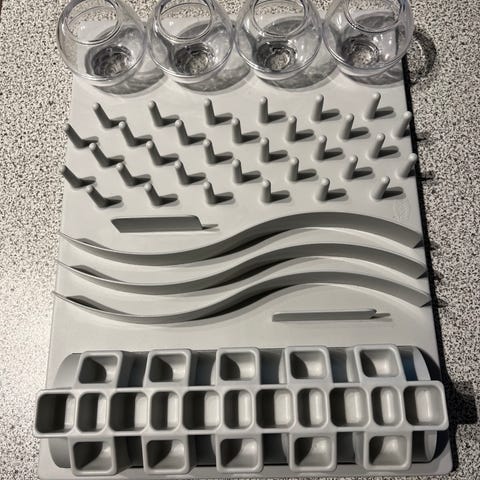 Aktivitetslege for katt. Et brett hvor du kan plassere små belønninger til katten din. Nesten som et brettspill for katten. De blanke koppene er av plast og kan tas løs for å vaske dem.
