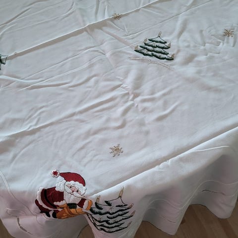 Liten juleduk 38 cm x 37 cm. Ikke brukt. Sydd for hånd. Stoffet er 100 % bomull. Hentes i Loddefjord - Bergen vest. Kan sendes men da betaler kjøper kostnaden.