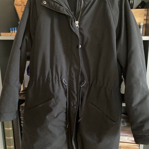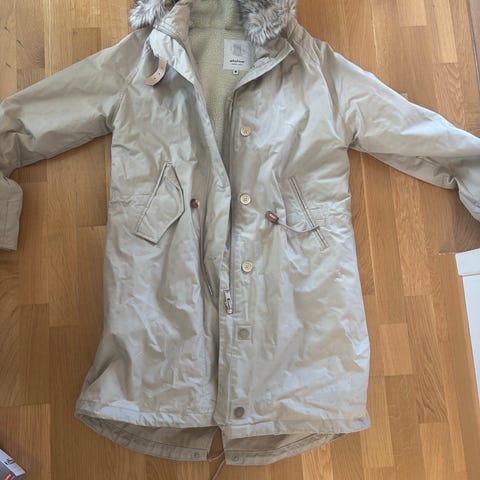 Den er vannavstøtende, og god og varm med mjukt for i rygg og hette. Den har også snøring i livet som ein kan justere sjølv. Hetten har også ein kant som kan brettes ned for ekstra beskyttelse. Størrelse M.