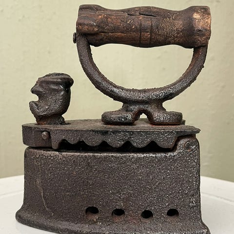 1850-talls dukke/miniatyr strykejern i messing med håndtak i tre. Hengslet luke bak hvor det puttes en oppvarmet, tilpasset sten eller jern for å stryke tøy. - 5 cm høy og 7 cm lang + 3 mm ekstra for øyekroken bak på luken. - 3 cm på det bredeste. - Dette ble sist brukt til å stryke dukkeklær av en liten pike for godt over 100 år siden. Når stykejernet var varmt, måtte det stå på det trebente smijern-stativet, som er 3,2 cm høyt og måler 5 cm i hver av de 3 ytterkantene. -